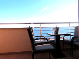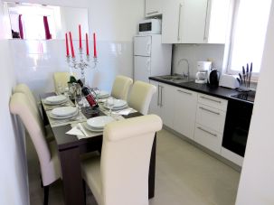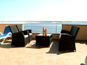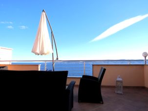 kuchyní, jídelnou a balkonem s venkovním posezením a nádherným pohledem na moře,
