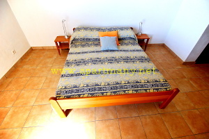 samostatná ložnice s dvojlůžkem volně spojená s vybavenou kuchyňkou, jídelní stůl a židle, koupelna