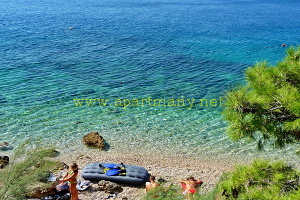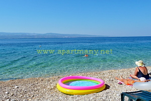 pláž s pozvolným, vhodným přístupem do moře pro děti i dospělé přímo pod apartmány.