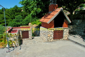 domu je venkovní zděný gril s posezením, který je možné používat po
