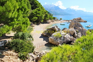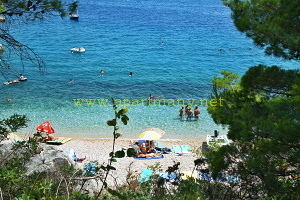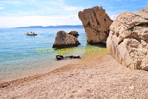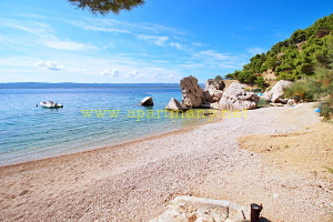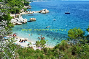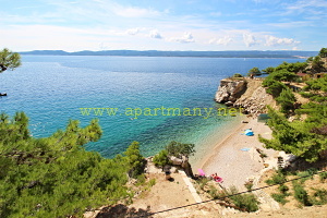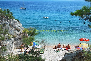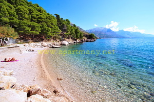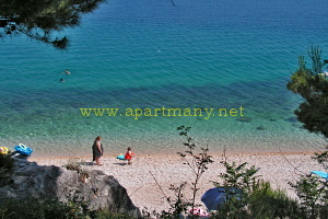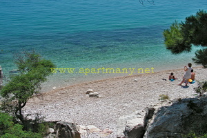pláž s pozvolným přístupem do moře, vhodným pro děti i dospělé pod apartmány. Na