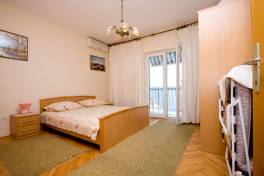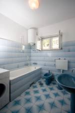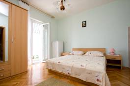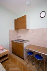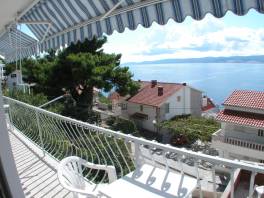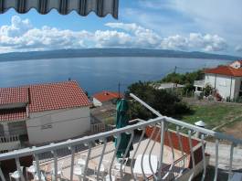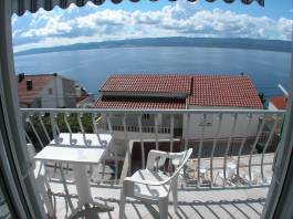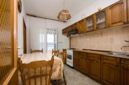 s jižním balkonem s výhledem moře. Má dvě vybavené kuchyně, jídelní stůl, židle, lednice, sporák, nádobí, příbory... U domu je